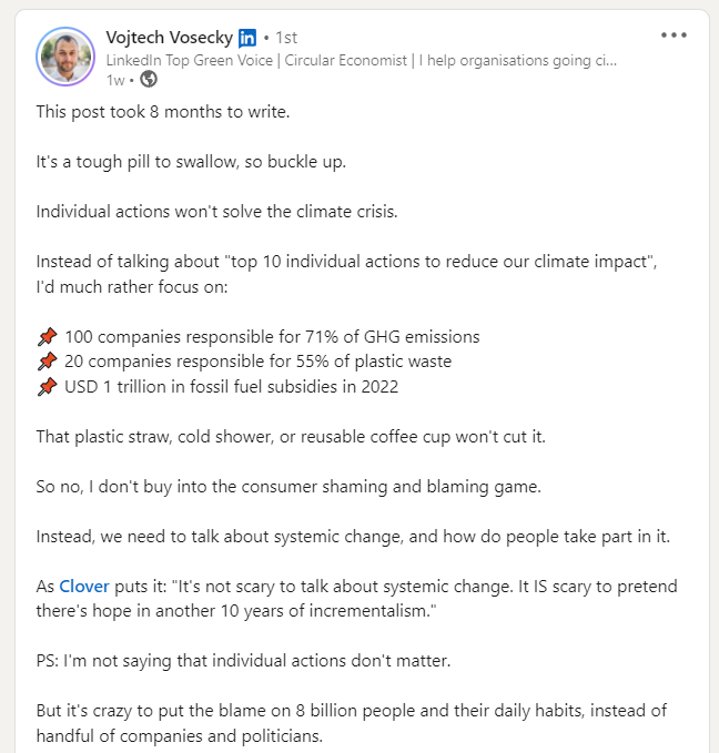 Blaming eight billion people (and trying to change their habits) does feel pretty ridiculous. It also misses the fact that while some of us are privileged enough to have access to better choices, many around the world don’t. But rather than see systems change and individual change as at odds with each other, I think its essential to recognise they are two sides of the same coin.